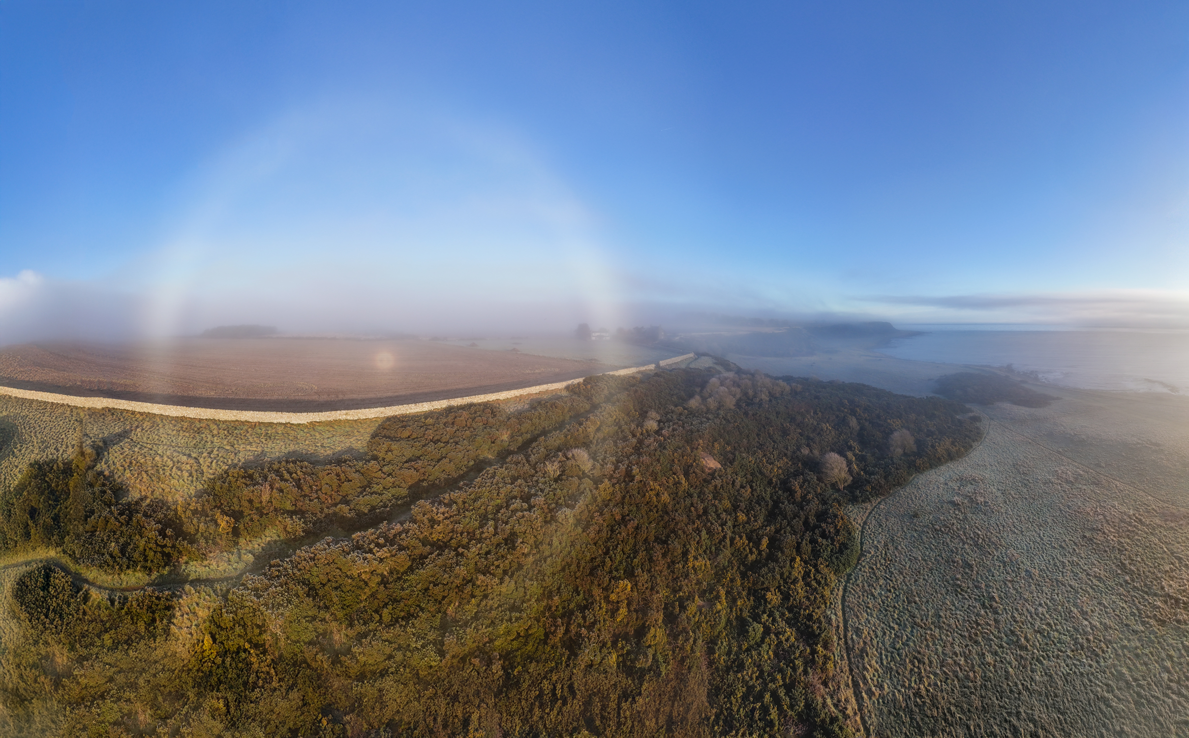 2026 has taken off quite literally with this breathtaking aerial capture.  One quiet morning, as the mist clung to the coastline and the light softened into a gentle hush, I sent my drone into the sky hoping, as always, to witness something extraordinary. What unfolded through the screen was beyond anything I’d anticipated: a full fog circle, ethereal and complete, encircling a Brocken spectre at its heart. From the ground, this would have appeared as a fog bow half an arc, ghostly and pale. But from above, the drone revealed the full phenomenon: a rare and haunting spectacle that felt like nature whispering a secret.